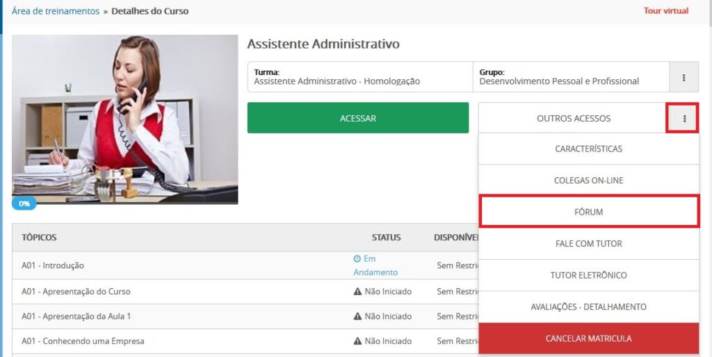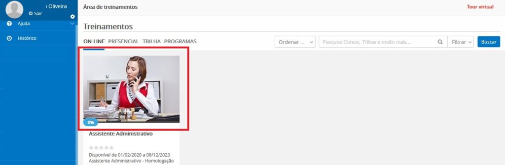 Após efetuar o login no ambiente virtual de aprendizagem, clique no curso em andamento.