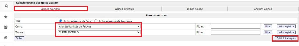 Selecione uma das opções o curso , a turma e clique que Exibir Informações.