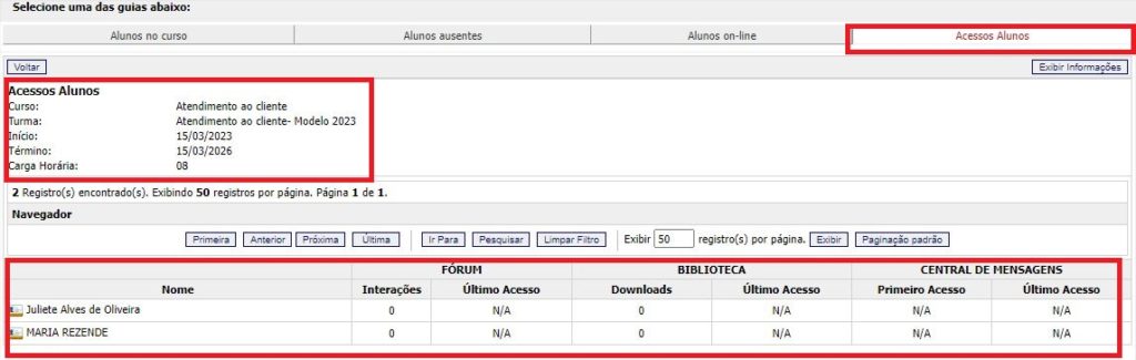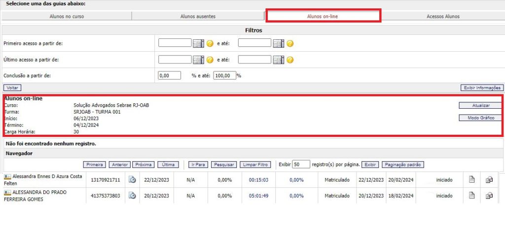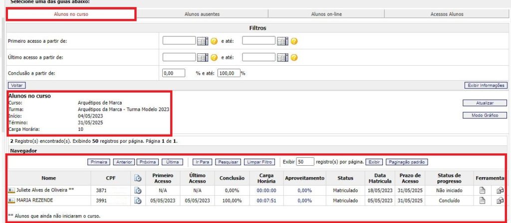 Serão exibidas as informações dos alunos da turma selecionada, como CPF, primeiro e último acesso, status de matrícula, o percentual de conclusão, o aproveitamento, o status e as ferramentas: meu histórico, mensagens, expectativa do curso, tutor eletrônico e o bloco de anotações.