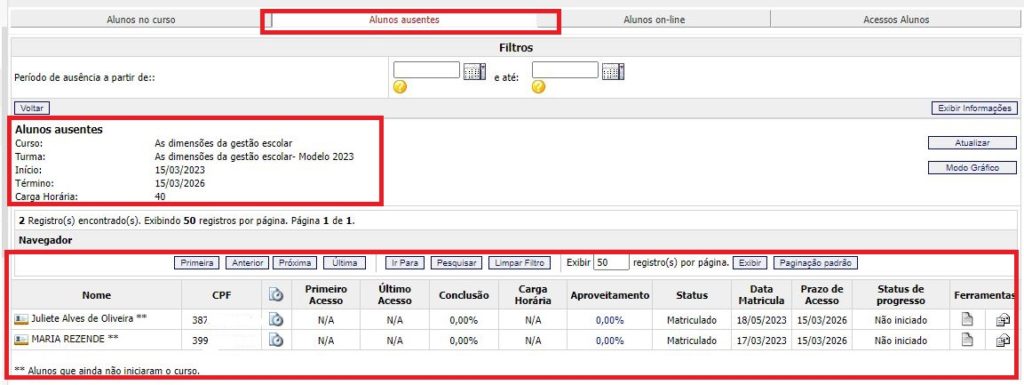 No menu Tutoria >> Alunos>>Alunos ausentes, é possível ter acesso aos alunos ausentes no curso.