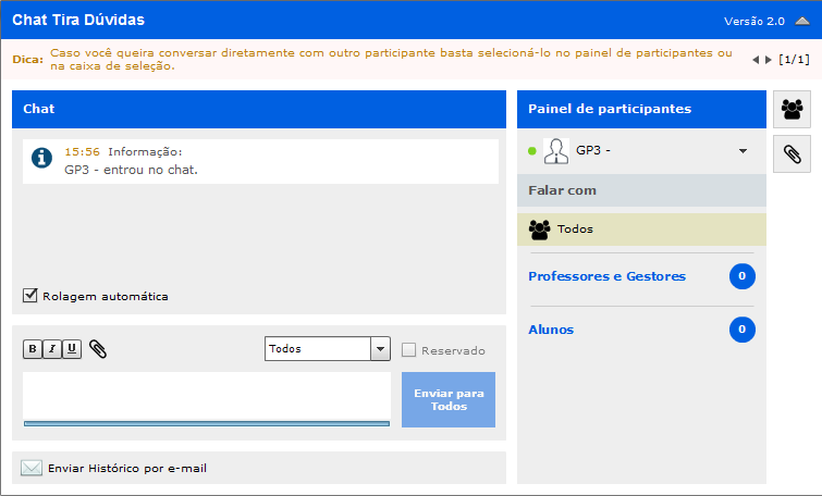 6. Na combo “Todos”, selecione o usuário para o qual deseja enviar sua mensagem. Obs.: para que a sua conversa seja privada, selecione a caixa “Reservado” antes de enviar a mensagem.