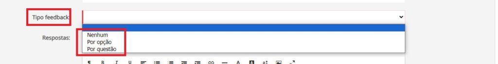 - Em Feedback você poderá escolher se será apresentado um feedback para o aluno de acordo com sua resposta. Caso opte por “Feedback por Opção”, cada opção de resposta irá possibilitar a inserção de um feedback que será apresentado ao aluno. Se optar por “Feedback por Questão”, você poderá aplicar um único feedback para a questão, independente da questão que o aluno escolha.