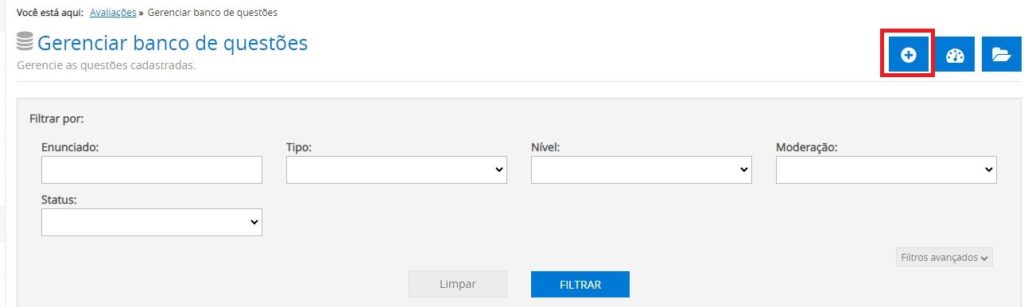 Acessando o caminho acima, será habilitado a tela abaixo. Clique no botão “Adicionar Questão”, destacado na imagem: