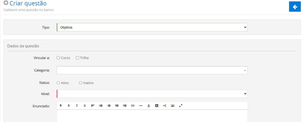 Neste exemplo, vamos realizar o cadastro de uma questão “Objetiva”. Ao selecionar este formato de questão o LMS apresentará o formulário abaixo:
