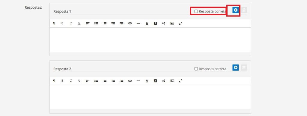 - No campo resposta, escreva o conteúdo que será apresentado para o aluno em cada uma das opções que for cadastrar. Caso queira incluir mais opções, basta clicar no ícone +. Não se esqueça de sinalizar para o sistema, qual das opções é a correta, conforme destacado abaixo: