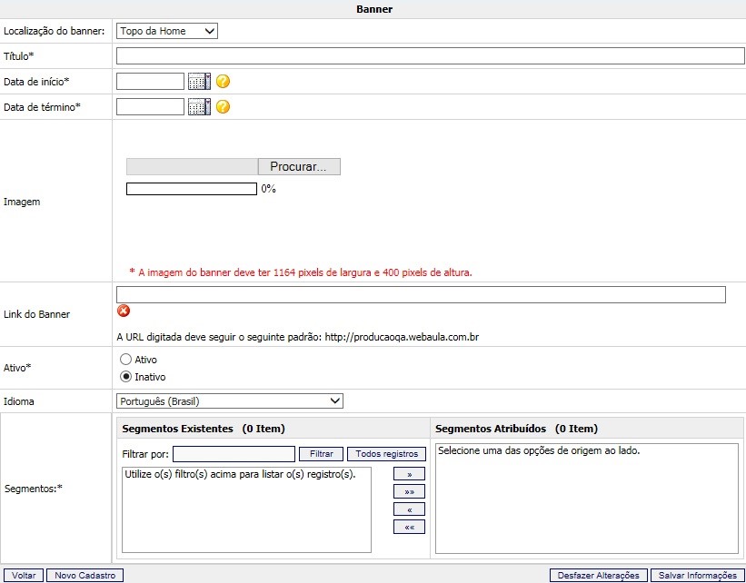 - No campo “Idioma”, selecione o idioma para o qual o novo banner deverá ficar disponível no Ambiente Aluno. Por ex.: se você cadastrar o banner para o idioma Inglês, alunos que utilizam a plataforma no idioma Português não poderão visualizá-lo.