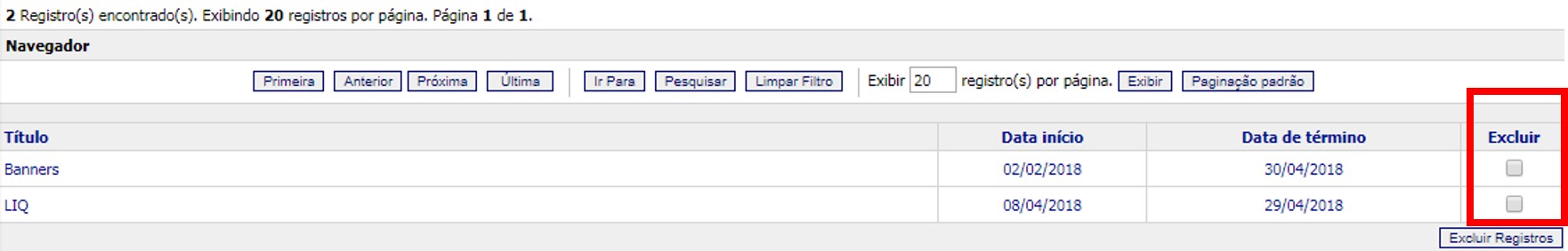 - No fim da tela habilitada, será apresentada a listagem de banners cadastrados, marque a caixa de seleção correspondente ao banner a ser excluído, na coluna “Excluir”.