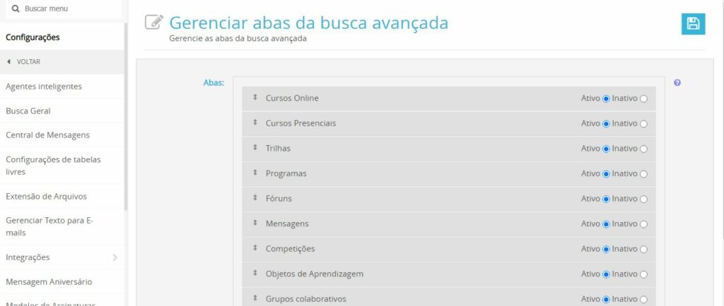 Busca Geral No menu Administrativo >> Configurações >> Busca Geral fazemos o gerenciamento de abas onde essa busca será realizada em todo o ambiente. r Atualizado em outubro 28, 2020 Este artigo foi útil? Sim Não