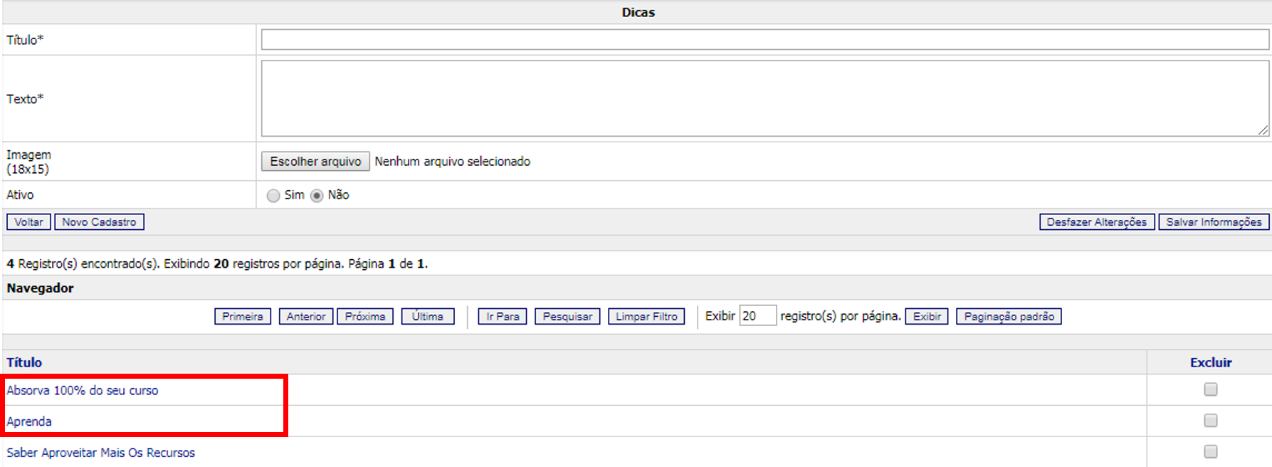 3. No campo “Ativo”, marque “Sim” para que a nova dica seja exibida no Ambiente Aluno; ou marque “Não”, para não exibi-la.