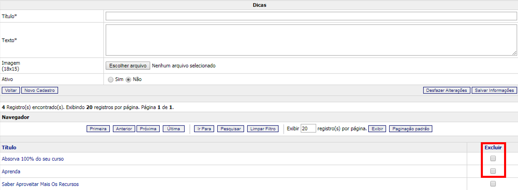 1. Na listagem de dicas cadastradas, marque a caixa de seleção correspondente à dica a ser excluída, na coluna “Excluir”.