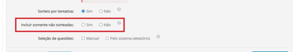 Assim, você poderá definir se na segunda tentativa serão utilizadas apenas questões que o aluno não realizou na primeira tentativa. Para ativar esta configuração clique em “Sim”, para utilizar qualquer questão atribuída a avaliação, independente se o aluno a realizou na primeira tentativa, selecione a opção “Não”.