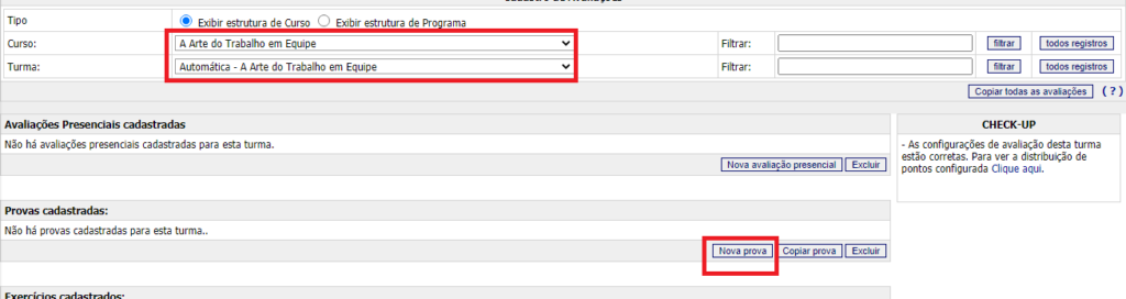 - Selecione o curso a turma e clique em Nova Prova.