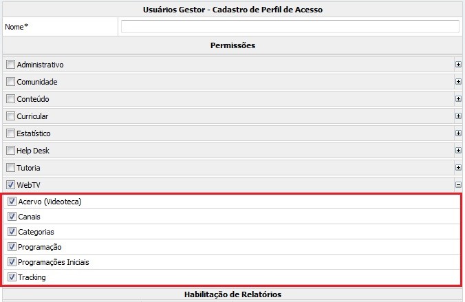 Não é obrigatório selecionar todas as opções dentro de um menu. Habilite apenas os recursos que deseja incluir no novo Perfil de acesso.