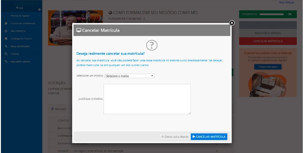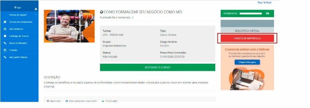 Se você se matricular em um curso e, antes de iniciá-lo, mudar de ideia, basta clicar em “Cancelar matrícula”. Para isso, acesse “Cursos em Andamento” e clique no curso em que você está matriculado para abrir a página de detalhes, onde estará o botão de cancelamento. Esta opção é possível para cursos com 0% de andamento.