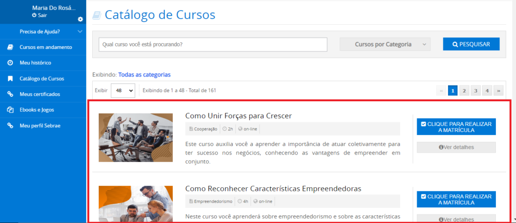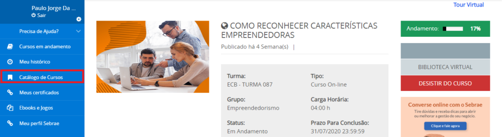 Catálogo de Cursos Nesse menu é feita a matrícula em cursos abertos para a inscrição. Serão exibidos os cursos disponíveis para matricula. Atualizado em outubro 28, 2020 Este artigo foi útil? Sim Não