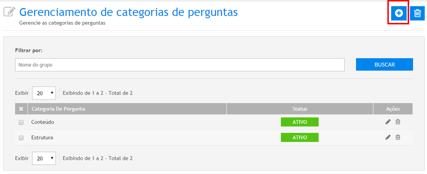 Na listagem de categoria de perguntas cadastradas, clique sobre o ícone “Excluir” na coluna ações.