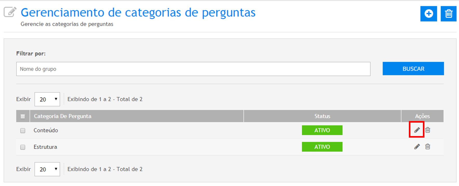 Na listagem de categoria de perguntas cadastradas, clique sobre o ícone “Editar” na coluna ações conforme destacado acima. As informações da categoria serão exibidas.