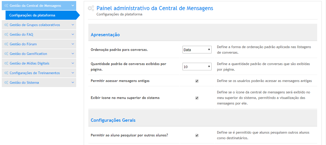4. Permitir ao aluno pesquisar gestores? – Define se um aluno poderá acessar a listagem de gestores para envio de mensagens.