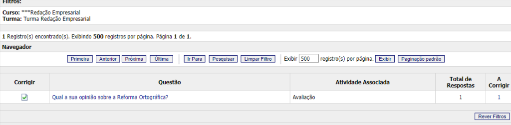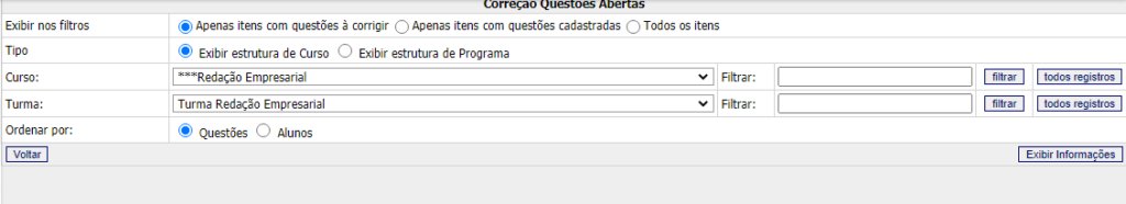 Serão exibidas as questões abertas da turma, clique na questão para correção.