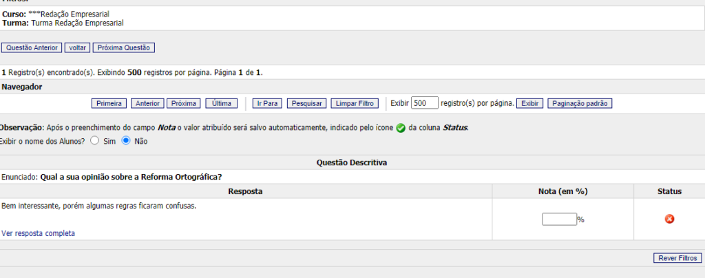 Ao abrir a questão o tutor pode lançar a nota do aluno.