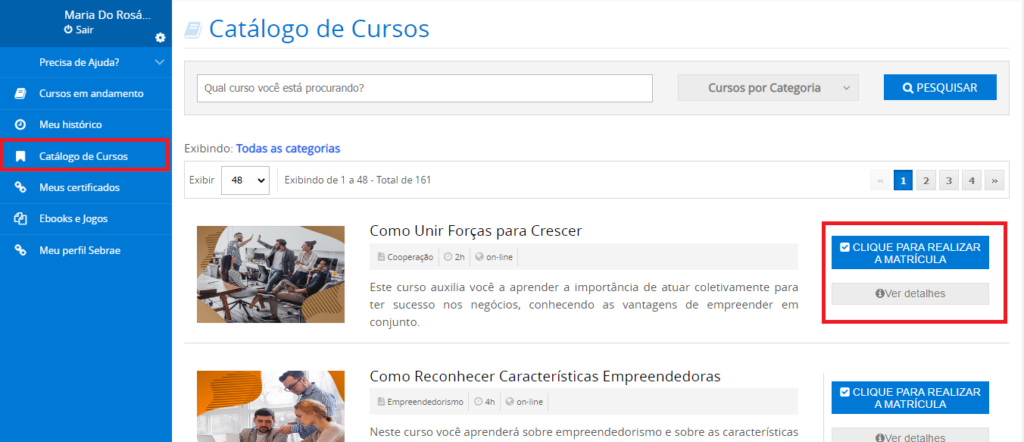 Após efetuar o login no ambiente virtual de aprendizagem, clique em Catálogo de Cursos, em seguida veja os detalhes do curso de seu interesse e clique em Realizar a Matrícula.