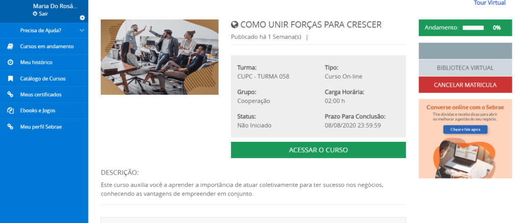 Após o procedimento acima, você será redirecionado para os detalhes do curso no qual foi efetuada a matrícula, clique em Acessar o curso.