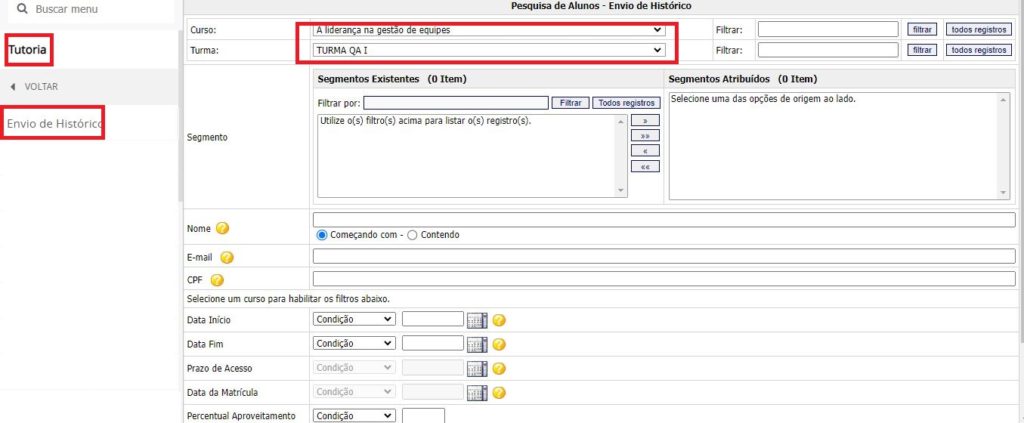 Através do menu Tutoria » Envio de Histórico, você poderá enviar aos alunos, por e-mail e/ou Central de Mensagens, o Histórico dos seus cursos concluídos. Selecione o curso/turma e as demais opções de acordo com pesquisa.