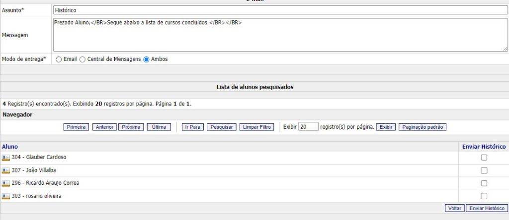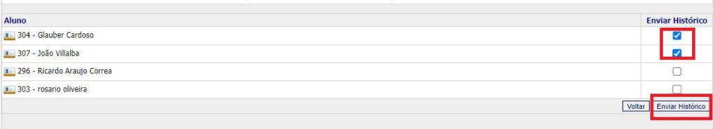 Em seguida, acione o botão Enviar Histórico. A mensagem “Deseja enviar o histórico para os alunos selecionados?” será exibida. Clique em OK para