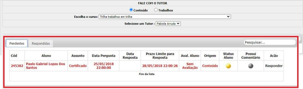 Para visualizar as perguntas feitas pelos alunos vá ao menu Tutoria >> Fale com o tutor. Na opção Conteúdo, selecione o curso/trilha e o tutor. serão exibidas as perguntas PENDENTES e RESPONDIDAS.