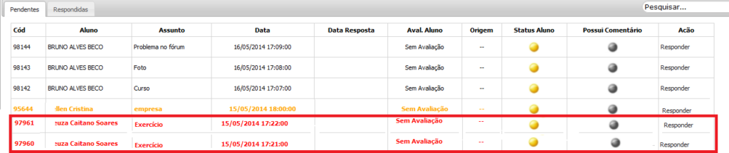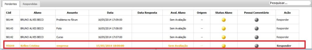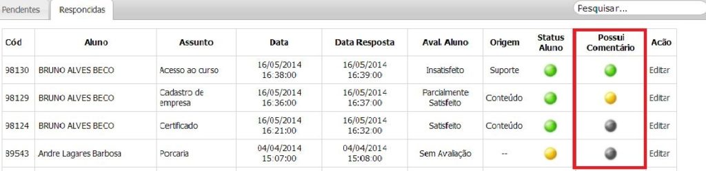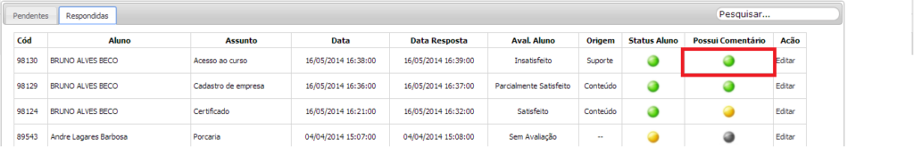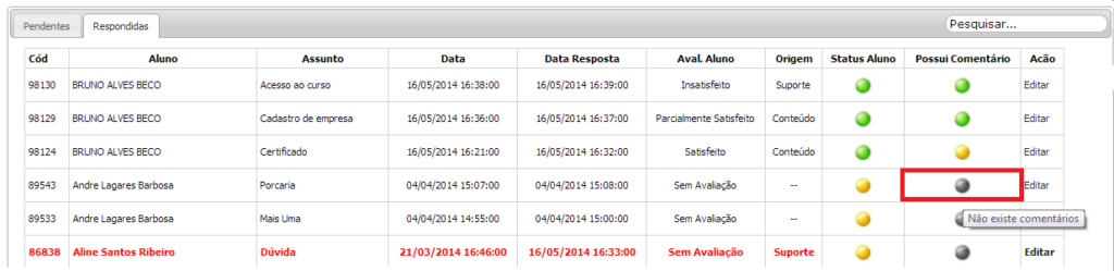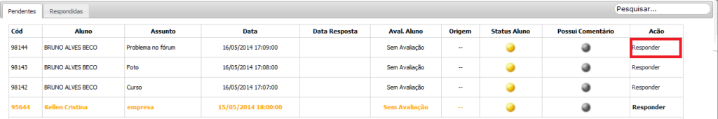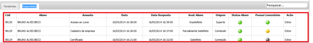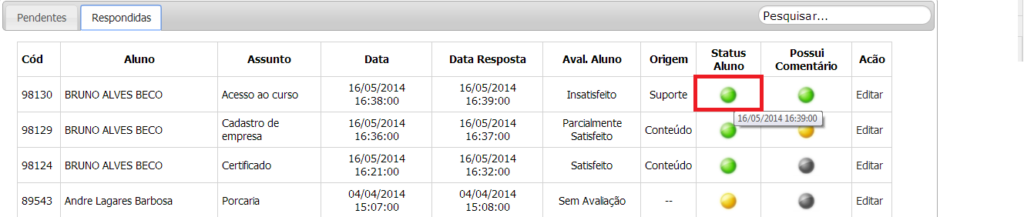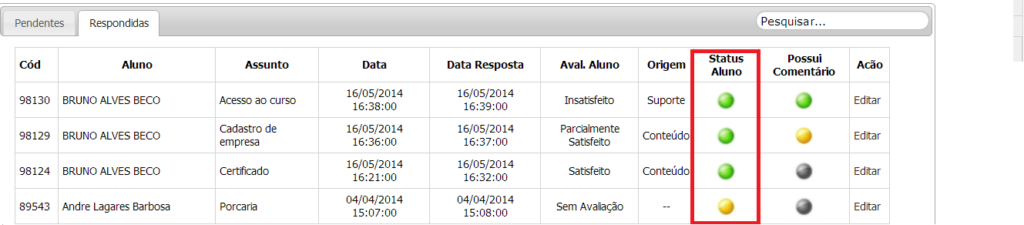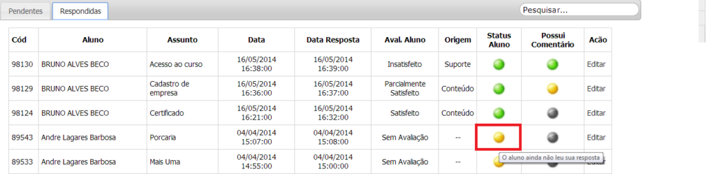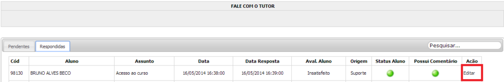 Na coluna Status Aluno o tutor poderá visualizar se aluno leu ou não sua resposta.