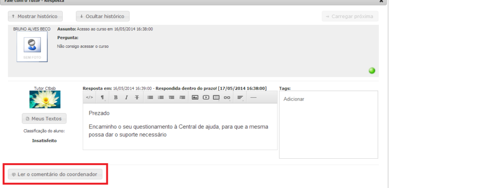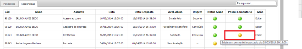 O coordenador poderá comentar a resposta do tutor, a indicação de comentário é exibida na coluna Possui Comentário.