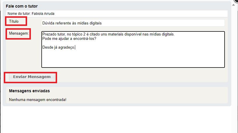 Clique em Fale com o tutor, para fazer uma pergunta ao seu tutor. Preencha os campos e clique em Enviar.