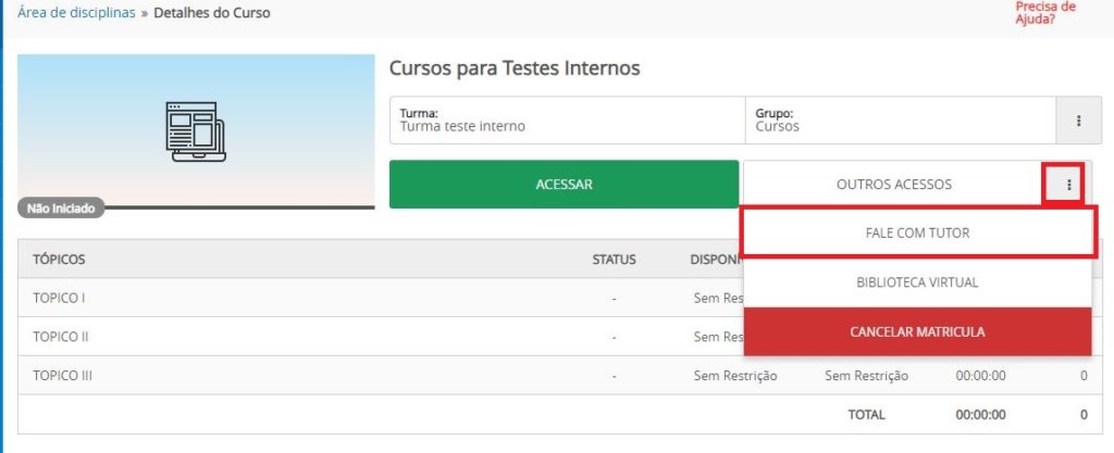 Em meus acessos, clique em Fale com o tutor, conforme imagem abaixo: