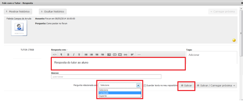 Na tela seguinte, preencha o campo de resposta, informe o tipo de pergunta, se é referente ao Conteúdo ou ao Suporte, faça a seleção e clique em Salvar.