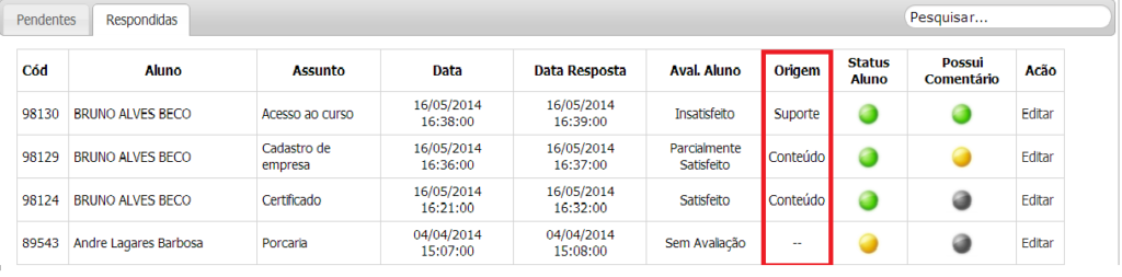 A origem da pergunta do aluno, se é relacionada ao conteúdo ou ao suporte, será exibida na coluna Origem presente na tela inicial do Fale com o Tutor.