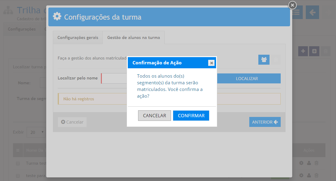 Após clicar em confirmar, a requisição assíncrona será iniciada e os alunos dos segmentos da turma matriculados.