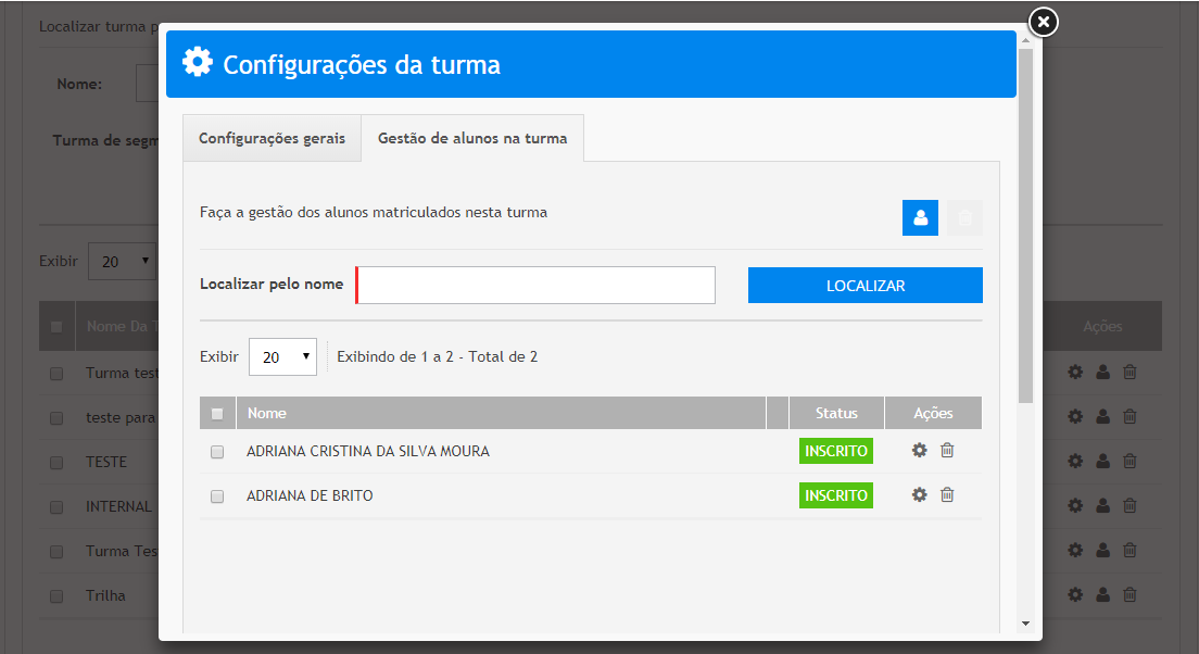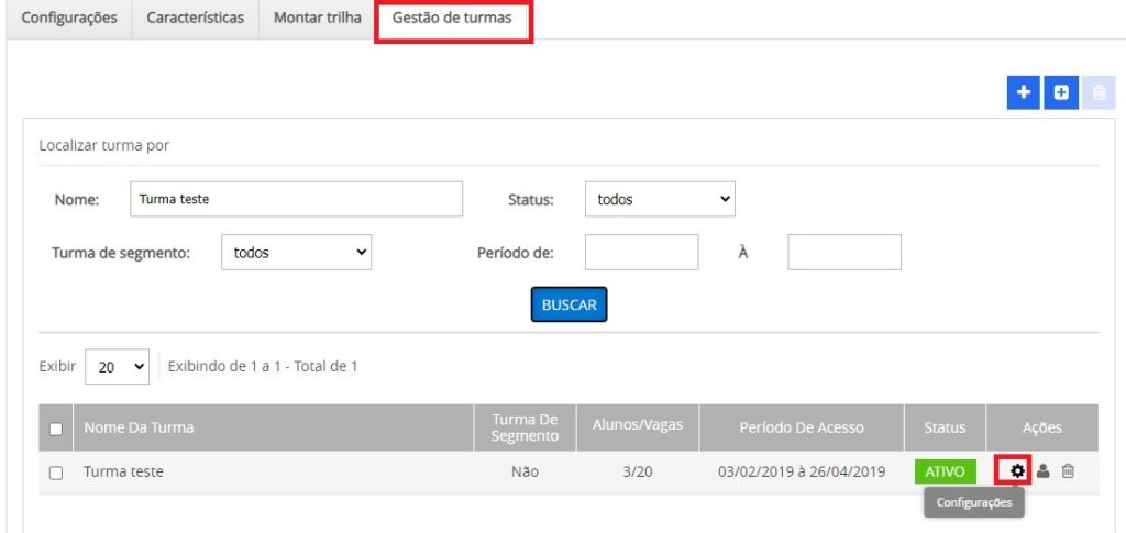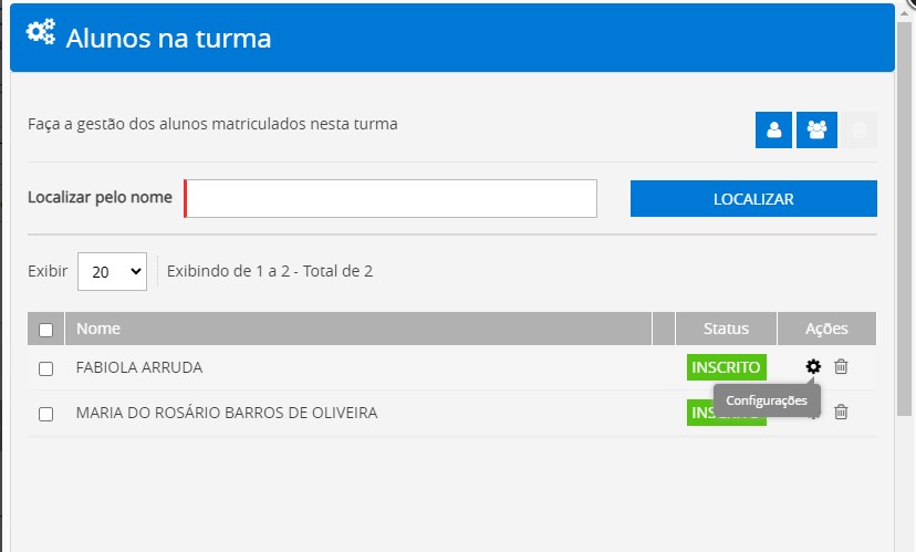 Serão exibidos todos os alunos da turma de trilha, clique em Configurações.
