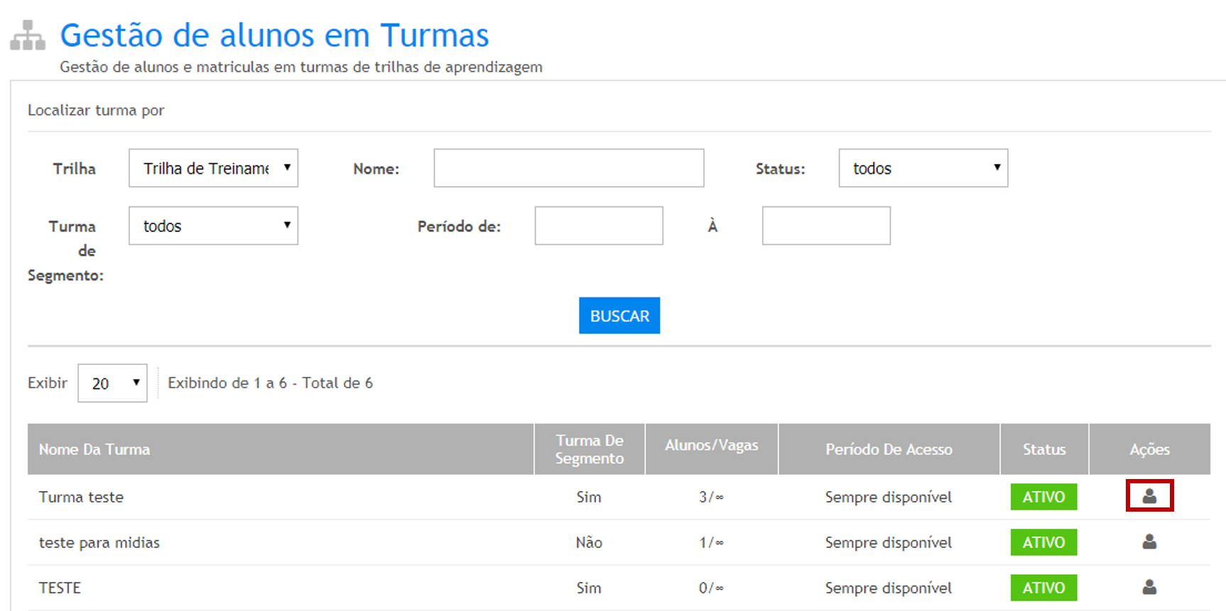 Para criar uma turma de Trilha de Aprendizagem segmentada clique no Ícone conforme destacado na imagem abaixo: