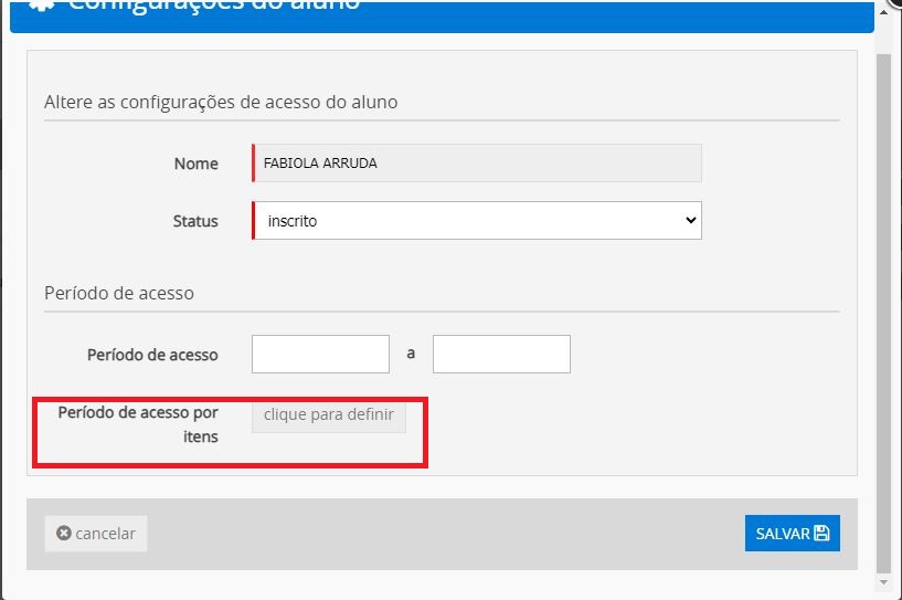 Na opção Período de acesso por itens , são exibidos todos os itens que compõem a trilha, coloque o prazo desejado e clique em Salvar.