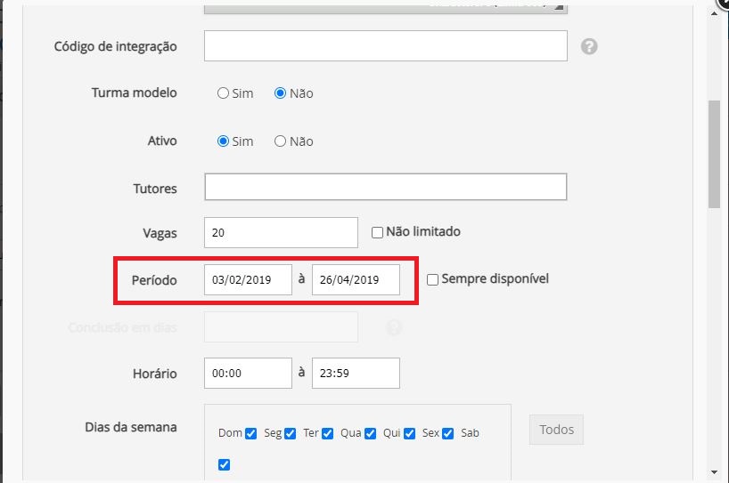 No campo “Período”, altere a data fim da turma de trilha.