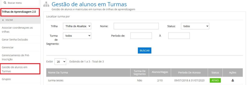 Para excluir alunos de uma turma de Trilha, acesse o caminho Conteúdo » Trilhas de Aprendizagem 2.0 » Gestão de Alunos em Turma. O sistema irá listar a tela abaixo com todas as turmas de trilha existentes, e também opções de filtro para encontrar com maior objetividade uma turma, para realizar ações referente aos alunos da turma, clique no item destacado: