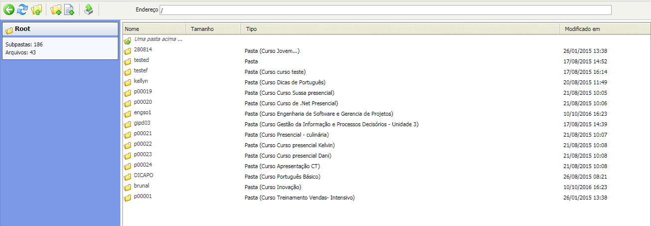 Para isso, acesse o caminho Gestor Conteúdo » Gerenciar Arquivos. O sistema apresentará a tela abaixo, onde serão listados todas as pastas de cursos existentes em sua plataforma: