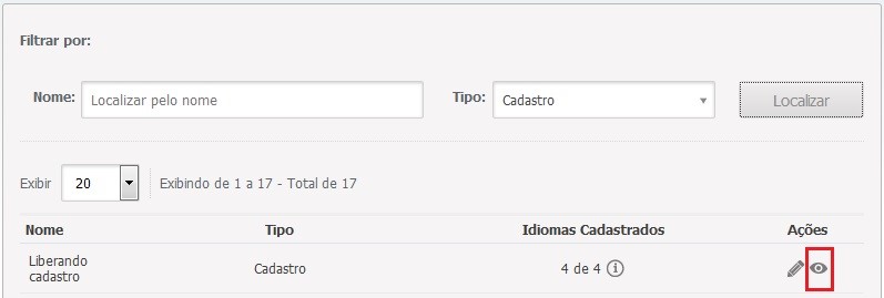 6. Para visualizar uma prévia do e-mail a ser enviado, clique sobre o botão Gerar preview. Dica: você também pode conferir o preview de um e-mail clicando sobre o ícone “Visualizar” (em destaque na figura abaixo) correspondente a ele, na coluna “Ações” da listagem de e-mails: