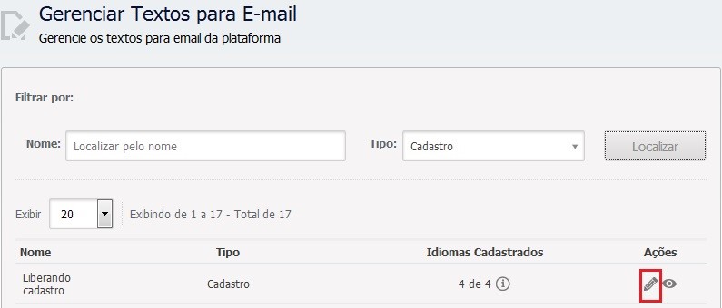 6. Para visualizar uma prévia do e-mail a ser enviado, clique sobre o botão Gerar preview. Dica: você também pode conferir o preview de um e-mail clicando sobre o ícone “Visualizar” (em destaque na figura abaixo) correspondente a ele, na coluna “Ações” da listagem de e-mails: