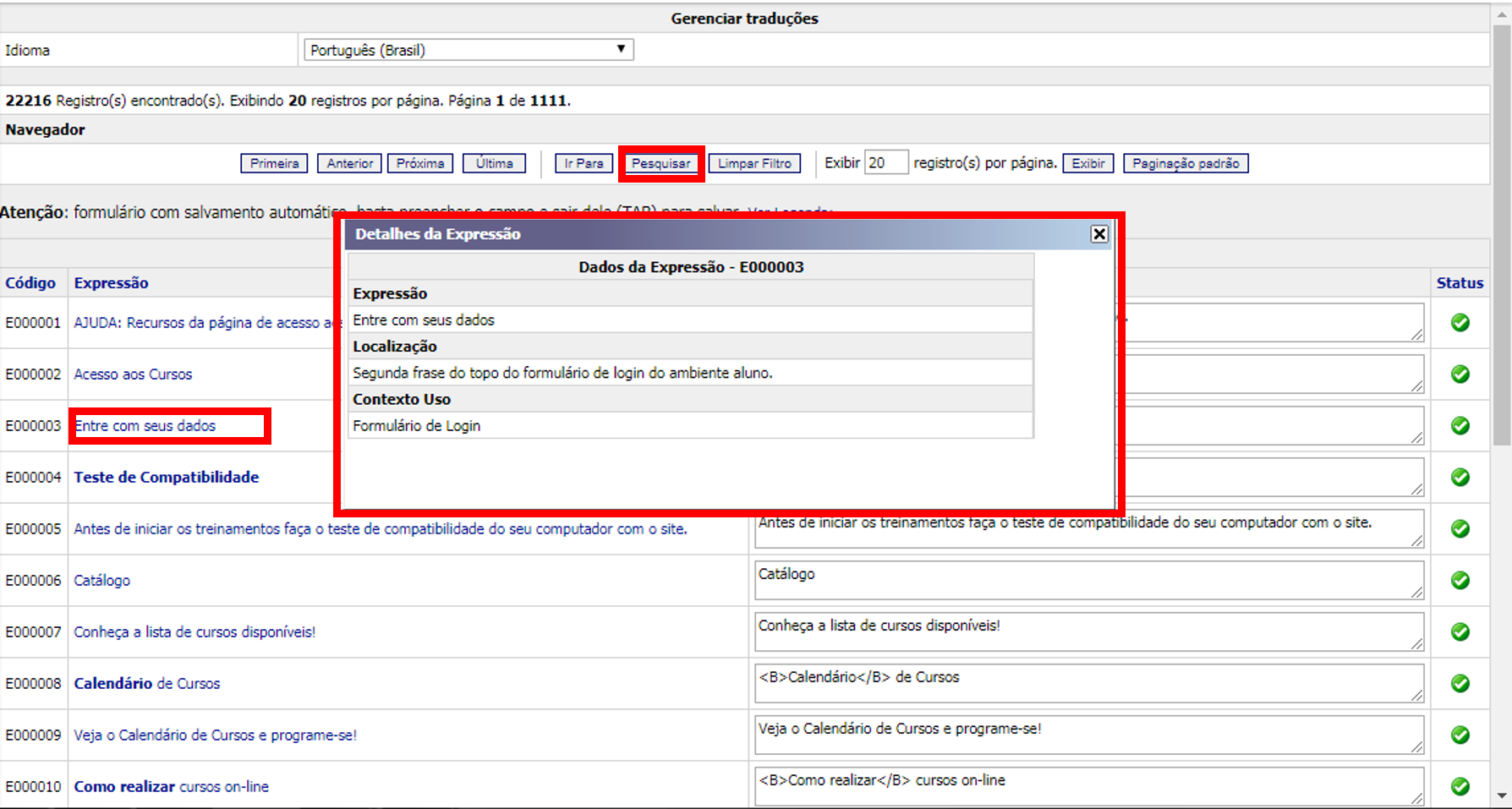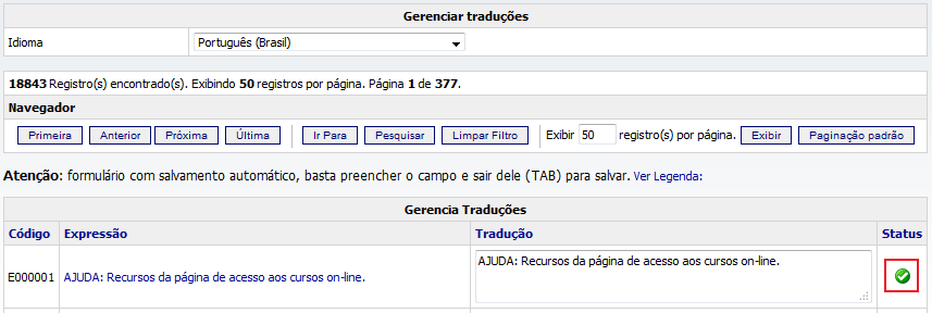 - Preencha o campo “Tradução” referente a cada expressão com a tradução da mesma para o idioma selecionado. Ao finalizar a edição o sistema irá alterar o status da tradução