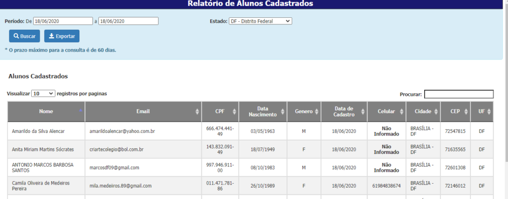 No menu Estatístico >> Gestor Estadual >> Alunos cadastrados, serão exibidos os alunos cadastrados no Estado selecionado.