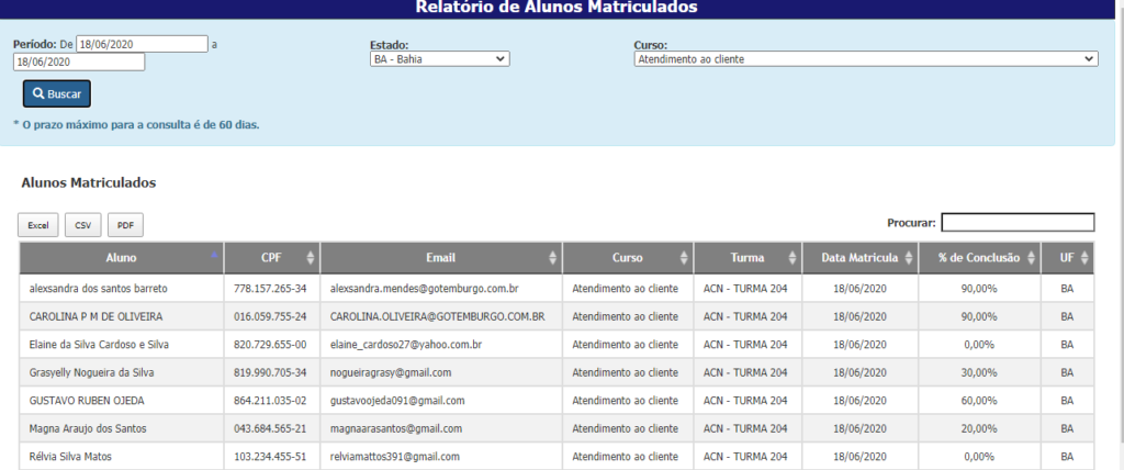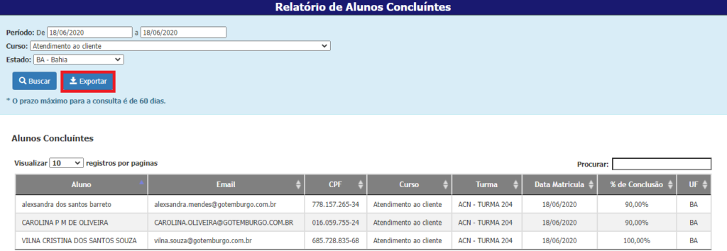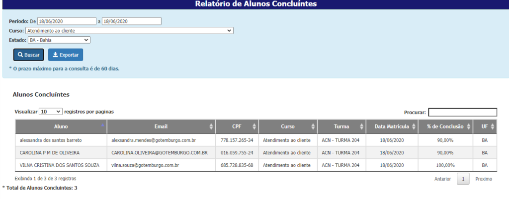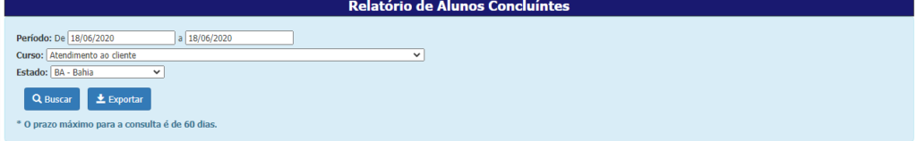 Serão exibidos os alunos concluintes de acordo com o filtro de pesquisa.