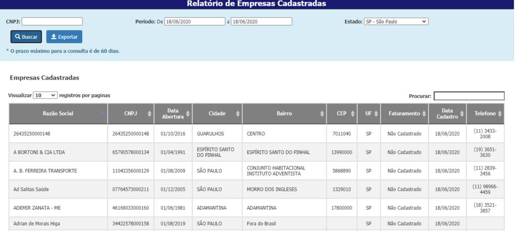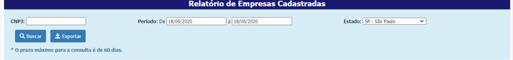 Serão exibidas as empresas cadastradas por Estado de acordo com os filtros de pesquisa.