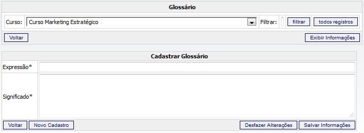 Acessando o caminho Conteúdo » Cursos » Glossário, o sistema habilitará a tela abaixo: