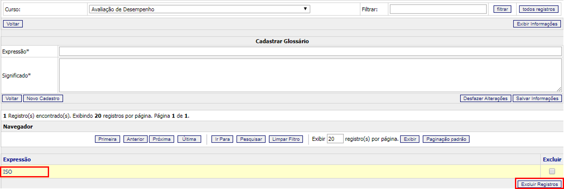Caso queira editar ou excluir expressões do glossário de um curso, realize os passos acima novamente e na listagem do glossário marque a caixa de seleção correspondente à expressão a ser excluída, na coluna “Excluir”. Para editar, clique no nome da expressão. Após realizar a edição clique em “Salvar Informações”.